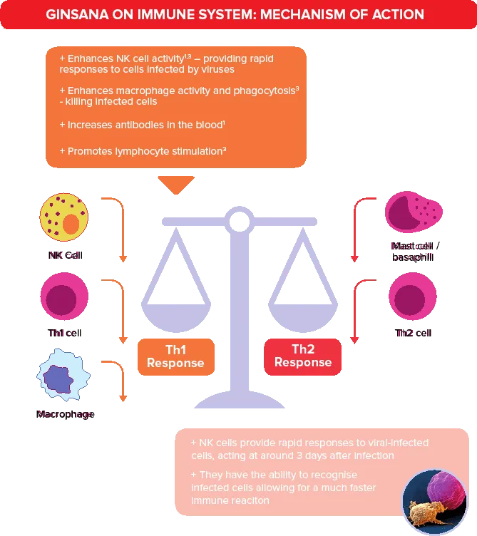 Ginsana has several effects on the immune system. Most of these influence the Th1 response, meaning that Ginsana® is able to rebalance the Th1 /Th2 ratio in favour of Th1, and consequently enhance the capacity of the body to fight against infections.