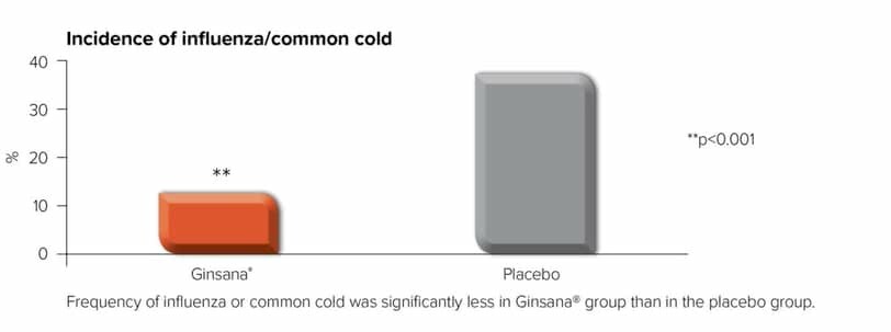 The proportion of volunteers catching influenza or cold was significantly lower in the Ginsana group. The levels of antibodies increased after vaccination and important immune cells were significantly higher after the 8th and the 12th week of treatment.1